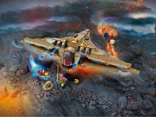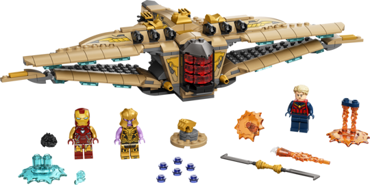 - в наборе: 3 минифигурки – Железный Человек, Капитан Марвел и Танос;