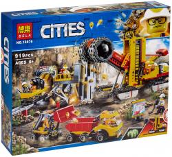 Центральным элементом новой шахты является дробильная машина (17х28х14) - массивное устойчивое транспортное средство на четырёх гусеничных колёсах. Lepin.by. Сбоку присутствует специальная шестеренка, которая приводит в движение фронтальные дробильные колёса. Расположенный сзади рычаг позволяет менять угол наклона дробильной установки. Попробовать дробильную установку в деле можно на стене фрагмента шахты, усыпанной золотыми самородками. Вращайте дробильные колёса, прислонив их к золотоносной стене, и наблюдайте за тем, как самородки один за одним падают к вашим гусеничным колёсам. Фрагмент шахты оборудован рельсами, по которым циркулируют две жёлтые тележки. Внутри шахты есть мостик для шахтёров на котором установлено два детонатора, нажав на которые, вы приведёте в действие механизм, отбрасывающий в сторону нижние горные породы. В комплекте набора: Минифигурки: 2 водителя, взрывмастер, шахтер, ученый. Начальник, медведь и паук. Дробильная машина. Погрузчик. Разрушаемая шахта с полостями для самородков и паука. Научная лаборатория. Узкоколейка. Научно-исследовательская станция. 2 вагонетки.