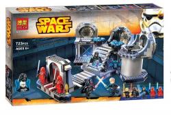 Охраной данного помещения занимаются Имперские гвардейцы, одетые в красную униформу и вооружённые силовыми пиками. Lepin.by. Интерьер покоев выполнен в серых тонах, также как и остальные помещения Орбитальной боевой станции. Центральное место отведено высокой лестнице, ведущей к чёрному вращающемуся торну. Рядом с ним видны симметричные энергетические модули и большой выпуклый иллюминатор. Правое крыло зала, напоминающее собой дозорную вышку, имеет несколько реалистичных особенностей, таких как крепление для наручников Люка Скайуокером и пол с функцией обрушения. В левой части тронного зала расположена шахта, ведущая к реактору Звезды Смерти. Размер тронного зала – 14х32х30 см.