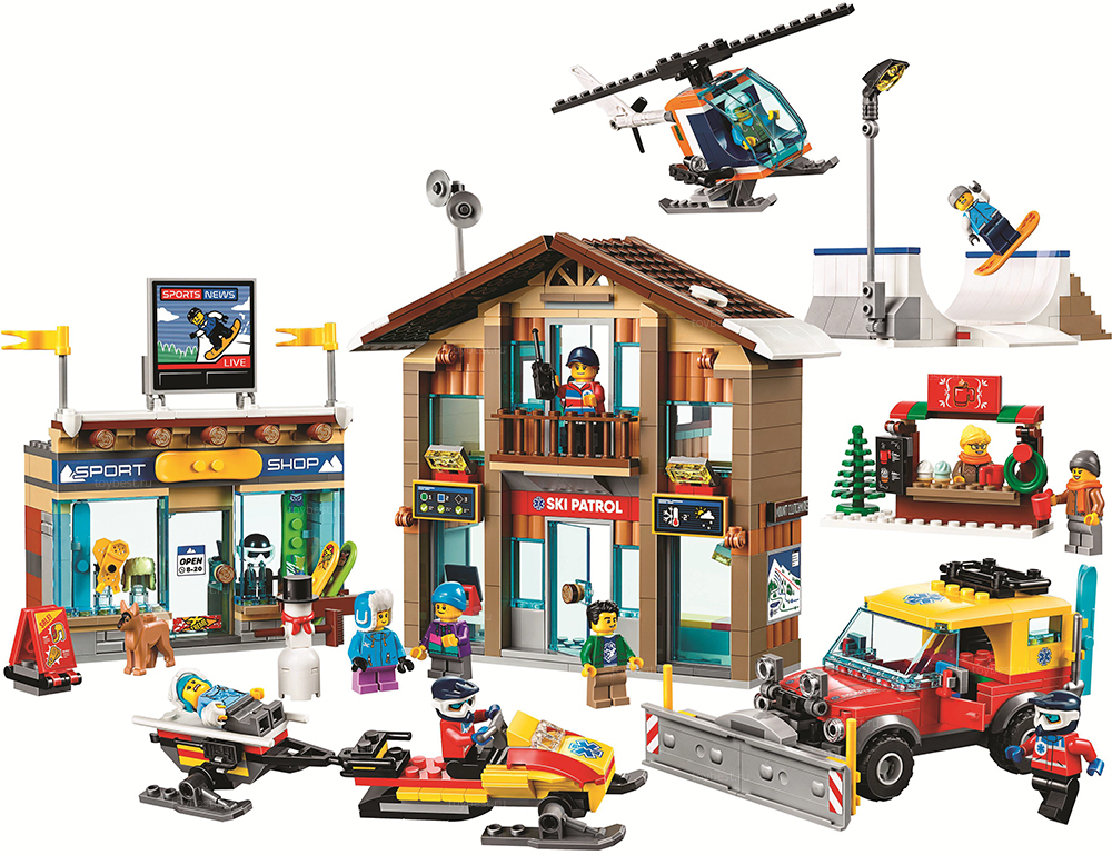 Одевайся потеплее и отправляйся кататься в горы с набором «Горнолыжный курорт». Потренируйся выполнять трюки на рампе или перилах в заснеженном парке или понаблюдай за другими сноубордистами, трюки которых снимают с вертолёта и показывают в режиме реального времени на большом экране, установленном над магазином по продаже лыж.